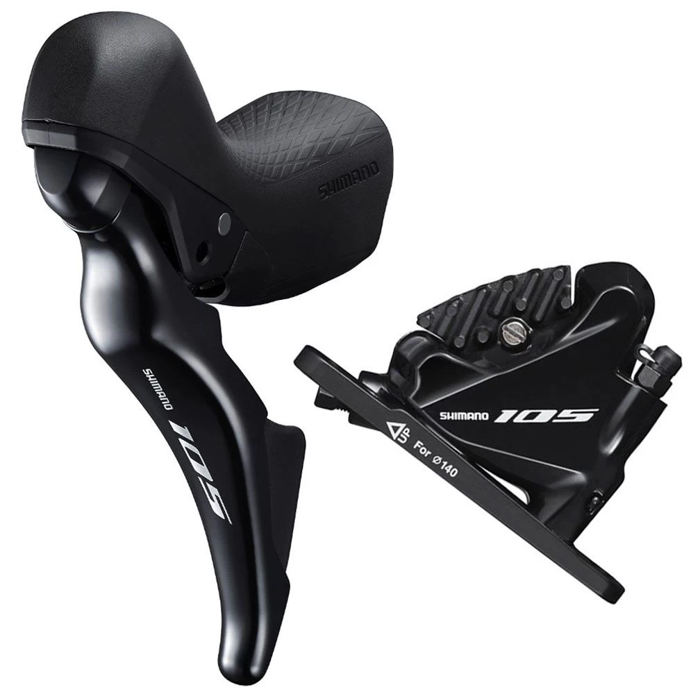 With smaller, sleeker hoods, the Shimano 105 2×11-speed compatible ST-R7025 STI with BR-R7070 caliper for hydraulic disc brake units deliver improved ergonomics for better rider comfort and control, with reduced lever stroke and lighter action.