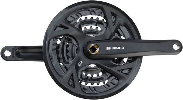 The Shimano FC-M371 crankset for square bottom brackets features a rigid 2-piece construction and Hyperdrive SG-X chainrings.