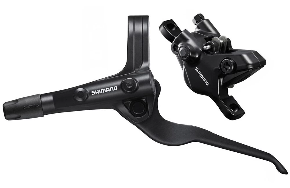 The hydraulic 2-piston disc brake from Shimano with ergonomic BL-MT402 3-finger brake lever and BR-MT410 caliper for balanced braking performance sets the standard for cost-effective performance braking systems.