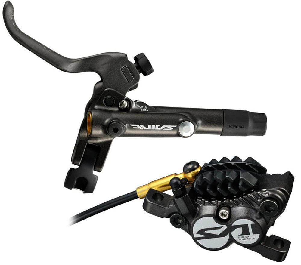 The SAINT BR-M820 hydraulic 4-piston disc brake with 2-finger brake lever from Shimano was developed with a focus on maximum downhill speed and is a reliable partner even on long, fast descents.
